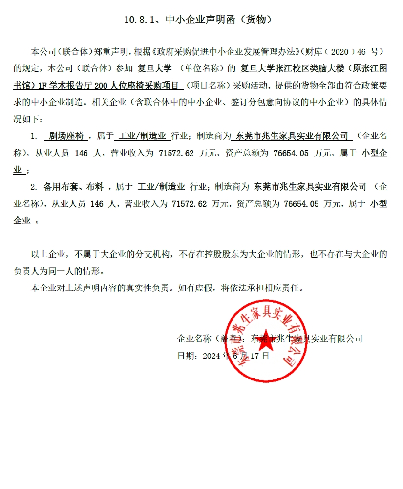 1 | 东莞市兆生家具实业有限公司 | 剧场座椅 | 东莞市兆生家具实业有限公司 | 常规 | 200人位 | 181,000.00 |