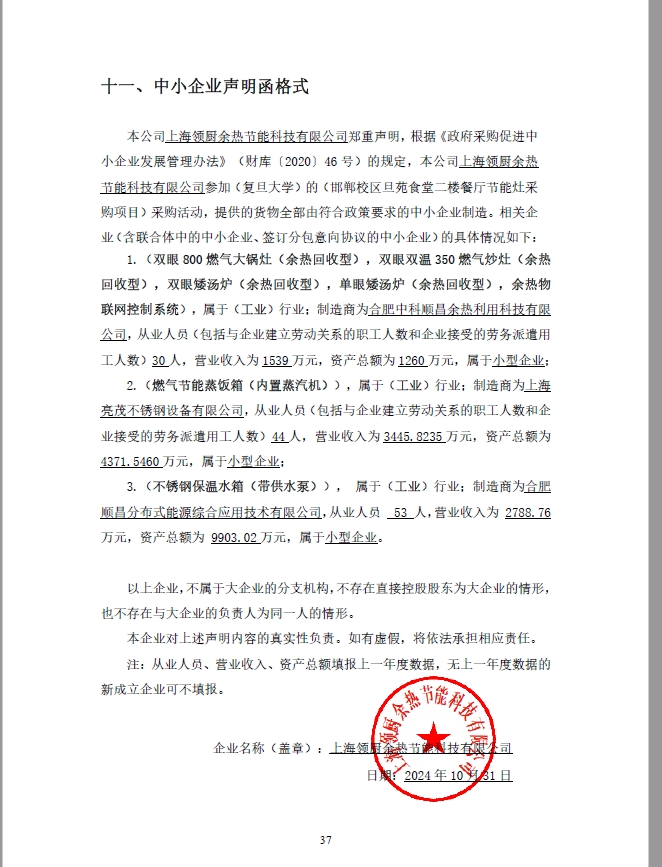 成交理由:本项目经过评审委员会各成员独立打分并汇总,上海领厨余热节能科技有限公司综合得分排名第一,最终得分为91分。