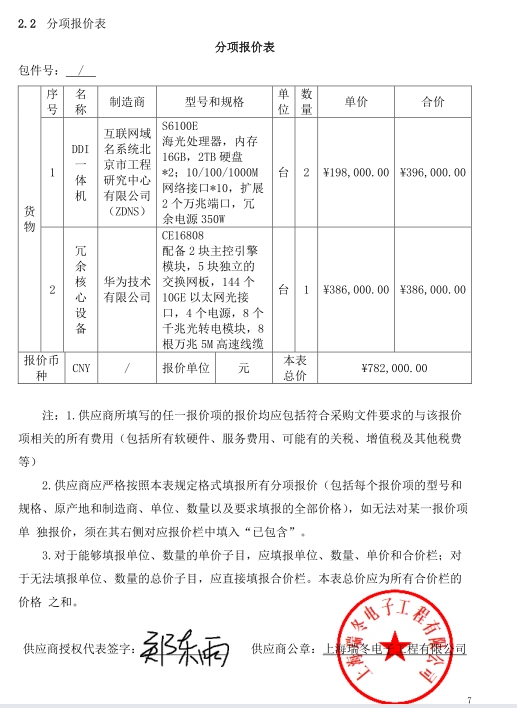 1 | 上海瑞冬电子工程有限公司 | DDI一体机 | 互联网域名系统北京市工程研究中心有限公司(ZDNS) | S6100E | 198,000.00 | 2 | 台 | 396,000.00 |